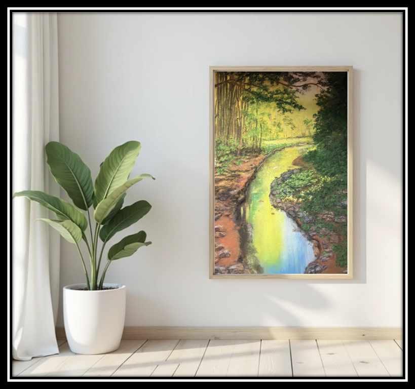 I painted "Hidden" to transport its viewers to a serene oasis nestled deep within the heart of nature. The painting depicts a lush, verdant forest brimming with life, where towering trees stretch their branches to touch the sky and intricate foliage dance in the gentle breeze.